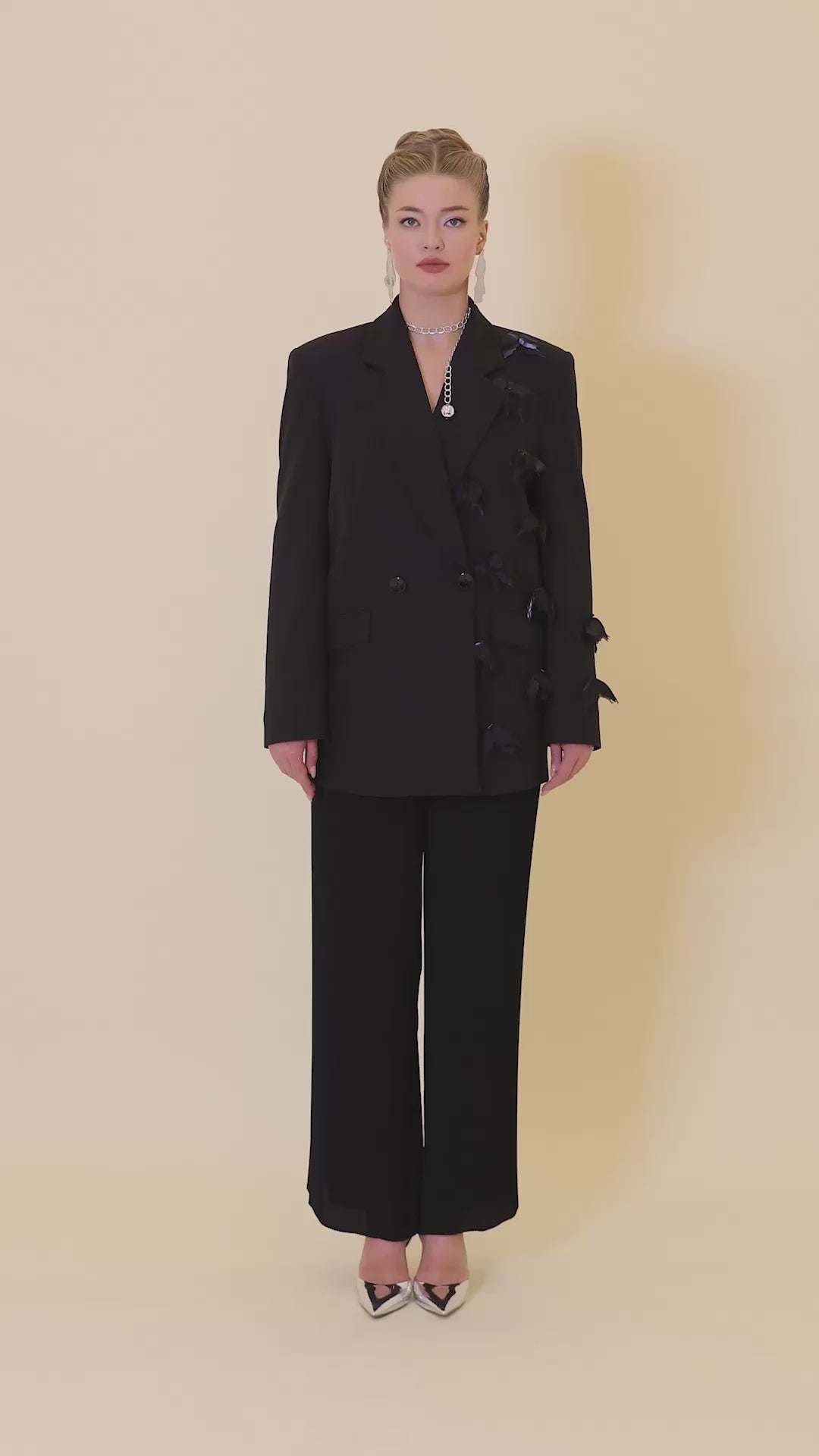 Product Features: Double-breasted, button-down, pockets, lining, vent, padded hem, butterfly accessory