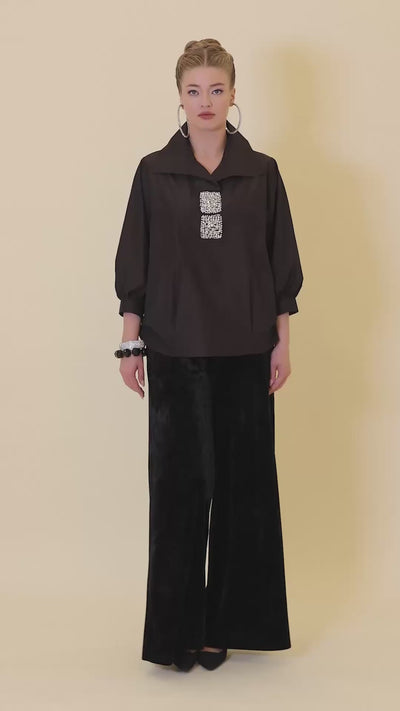 Embroidered Taffeta Blouse is designed to offer a sophisticated appearance with its elegant fabric and detailed stone embroidery. Its primary purpose is to provide both comfort and style for various occasions.