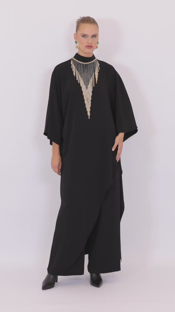 Product Features: Mandarin Collar, Brit Closure, Necklace Accessory, Kaftan-Pants Set, Pockets